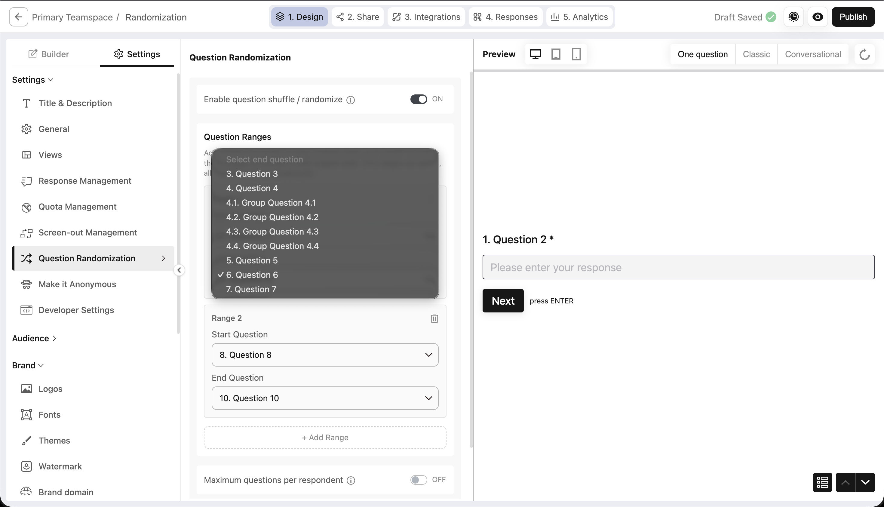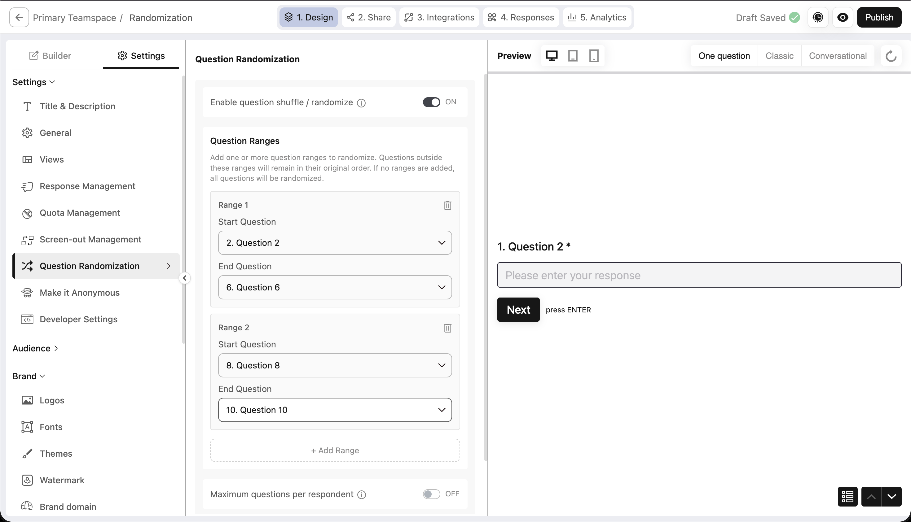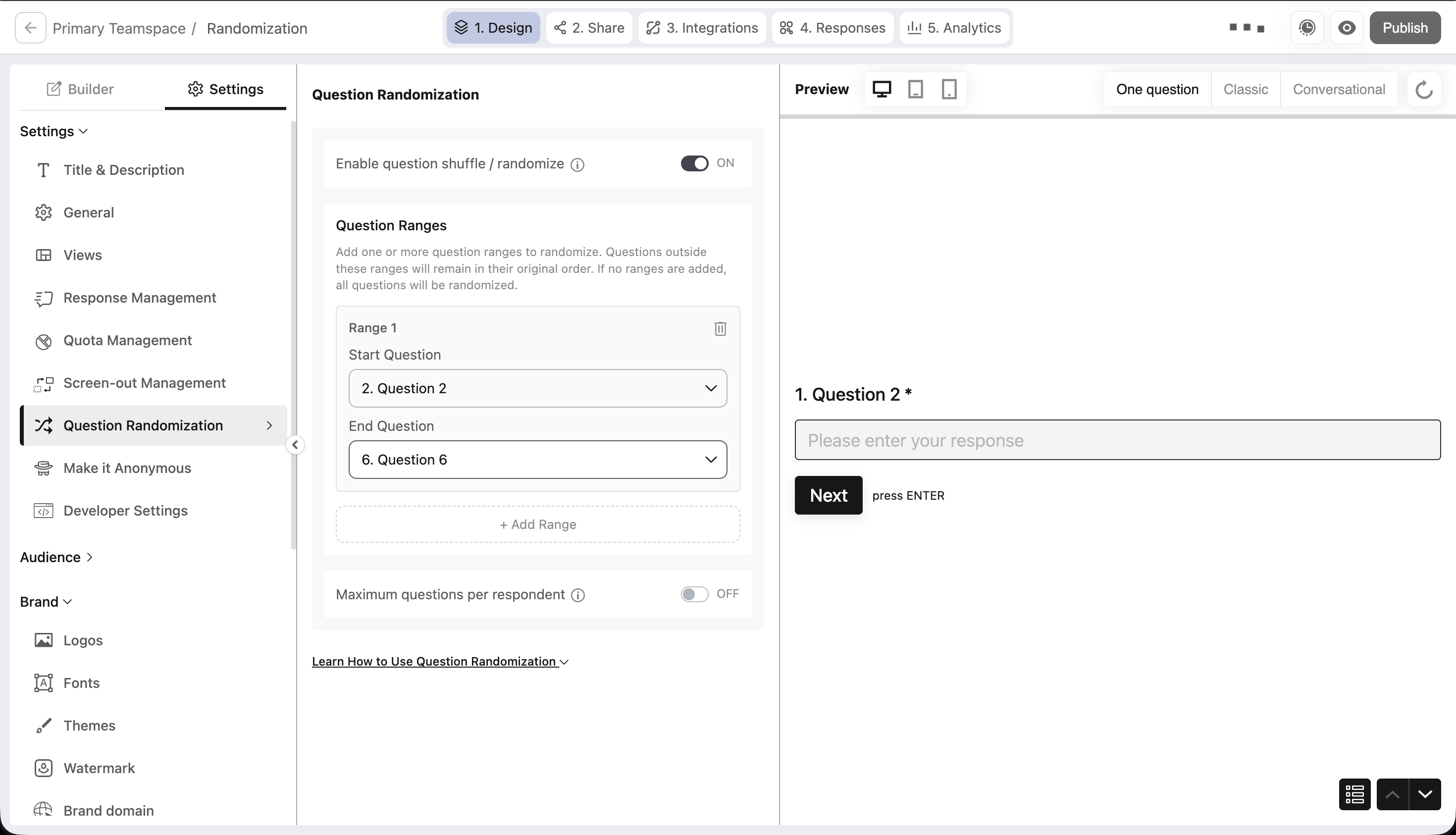 What if you want to keep your intro and closing questions fixed, but shuffle everything in between? That's exactly what range-based randomization gives you.