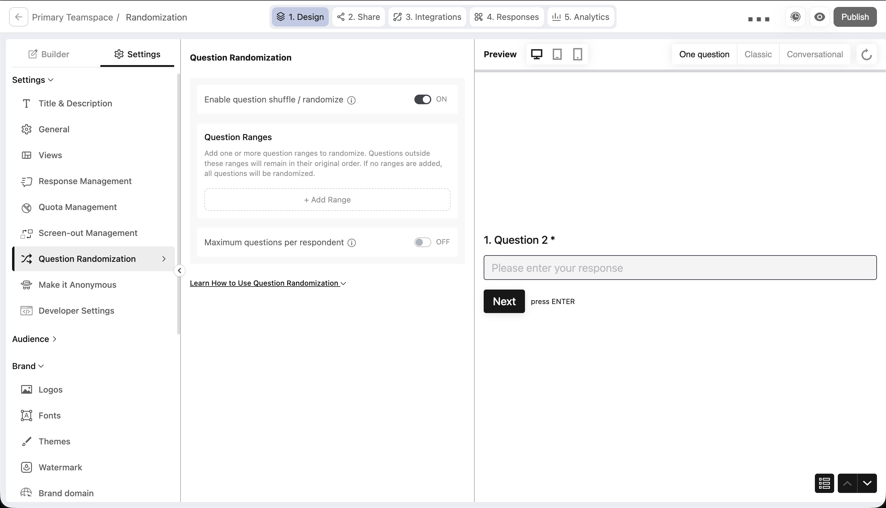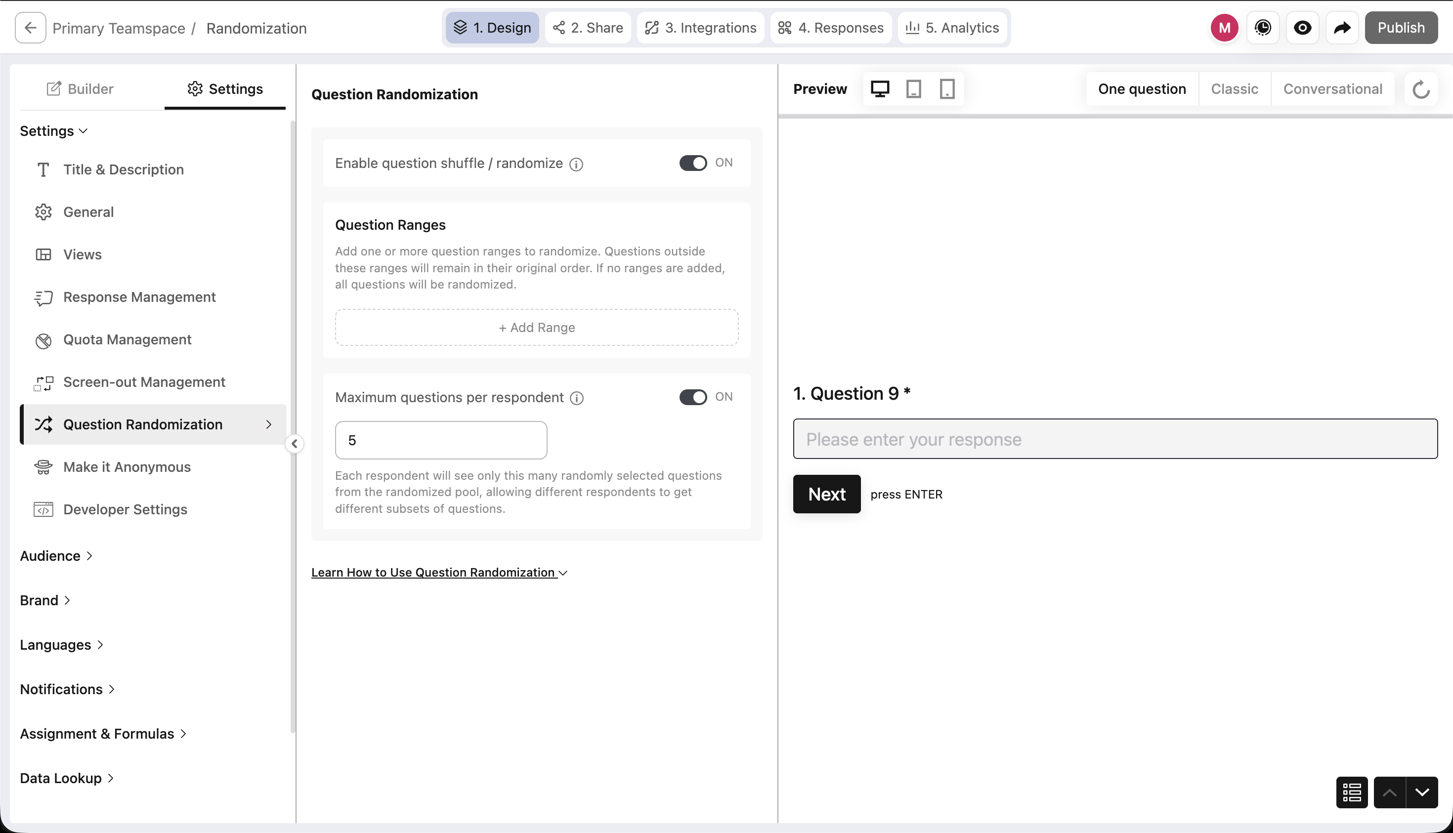 This is the simplest way to get started. Toggle on Enable question shuffle/randomize and you're done every question in your survey gets shuffled into a random order for each respondent.