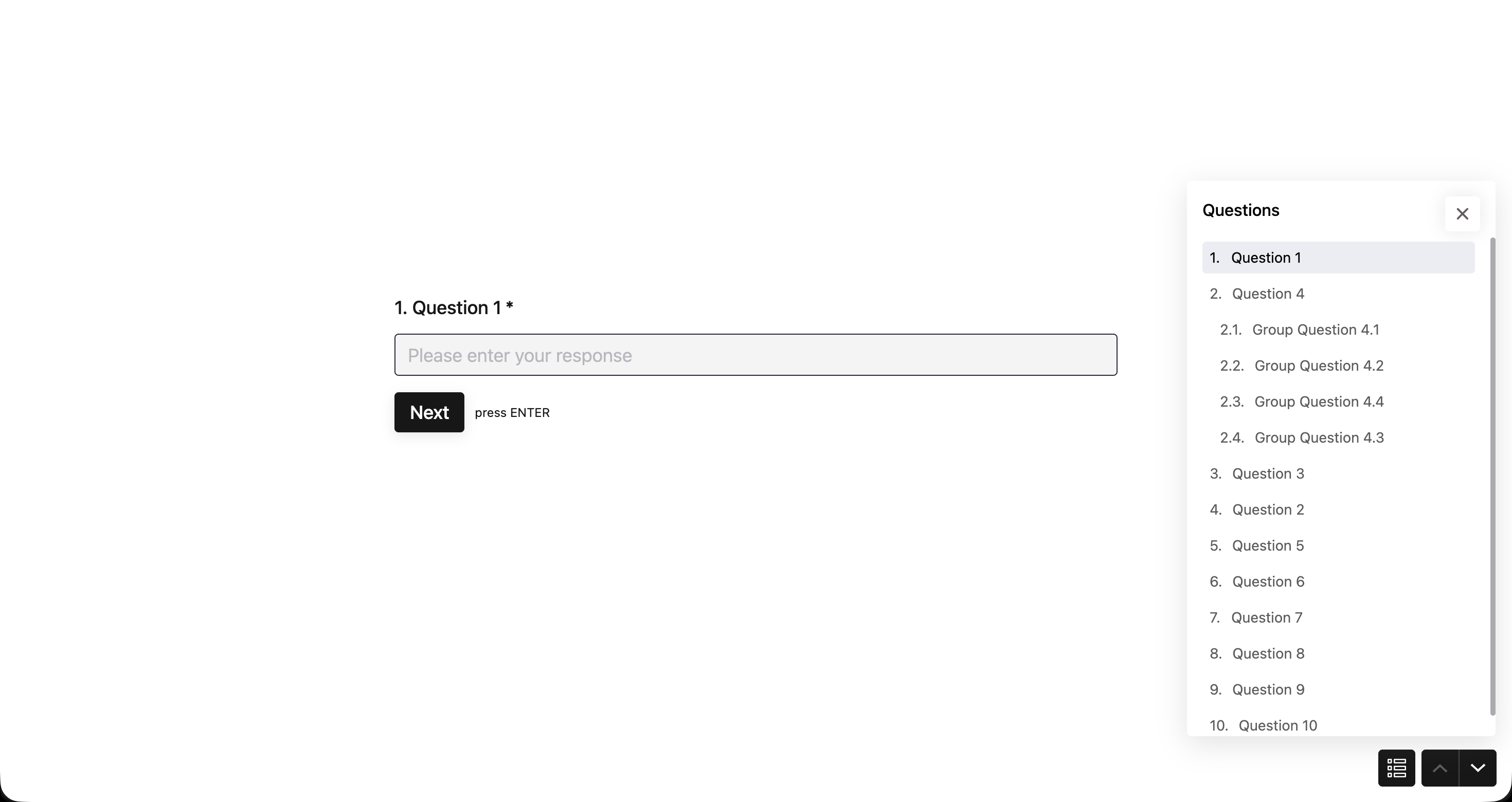 BlockSurvey lets you nest sub-questions under a parent question these are called group questions. For example, Question 4 might be a group with sub-questions 4.1, 4.2, 4.3, and 4.4.